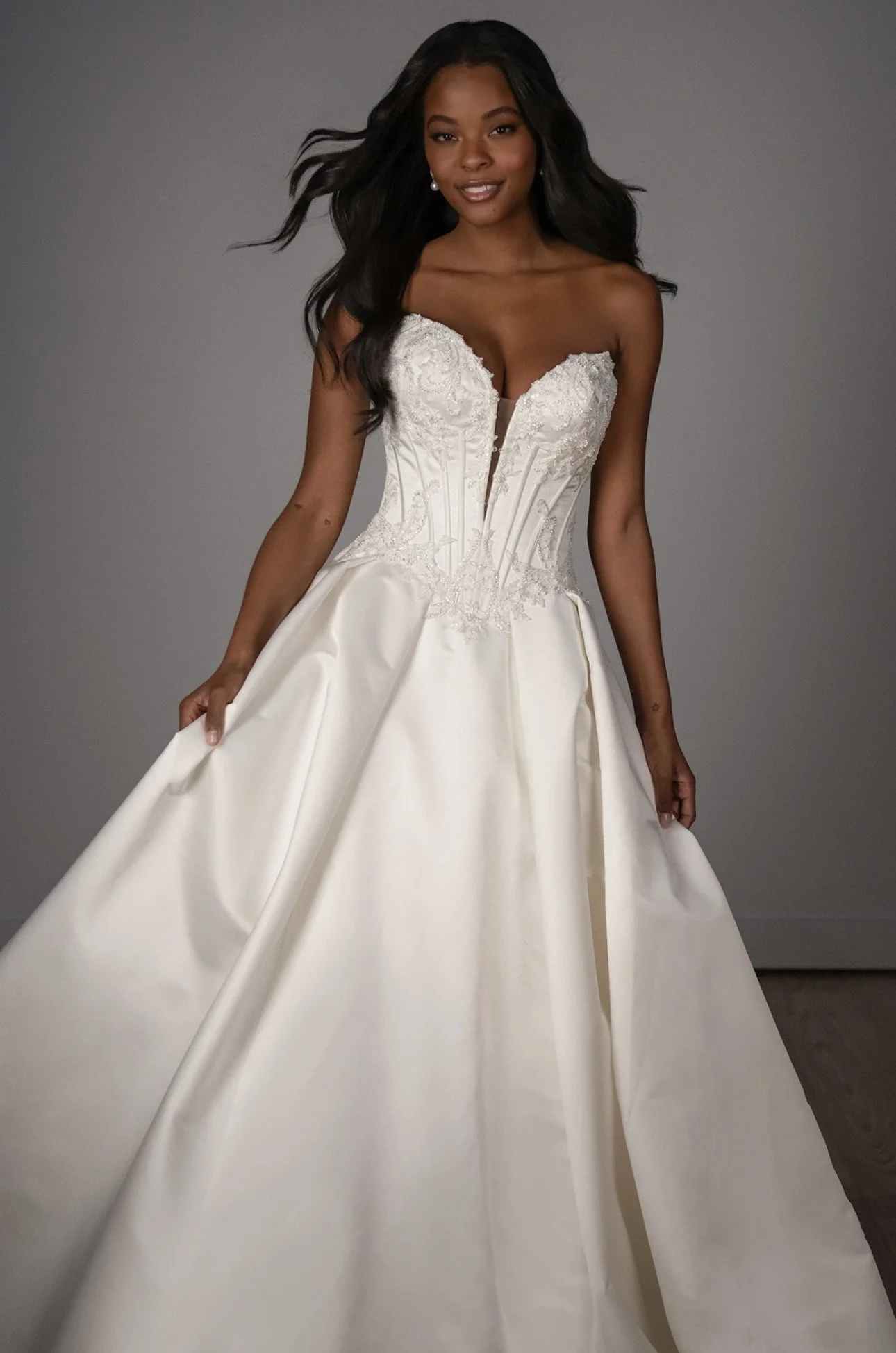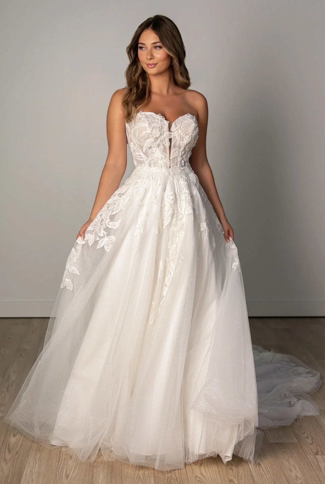 For that true princess moment, Aurora delivers a breathtaking strapless tulle ballgown that combines classic elegance with modern sophistication.