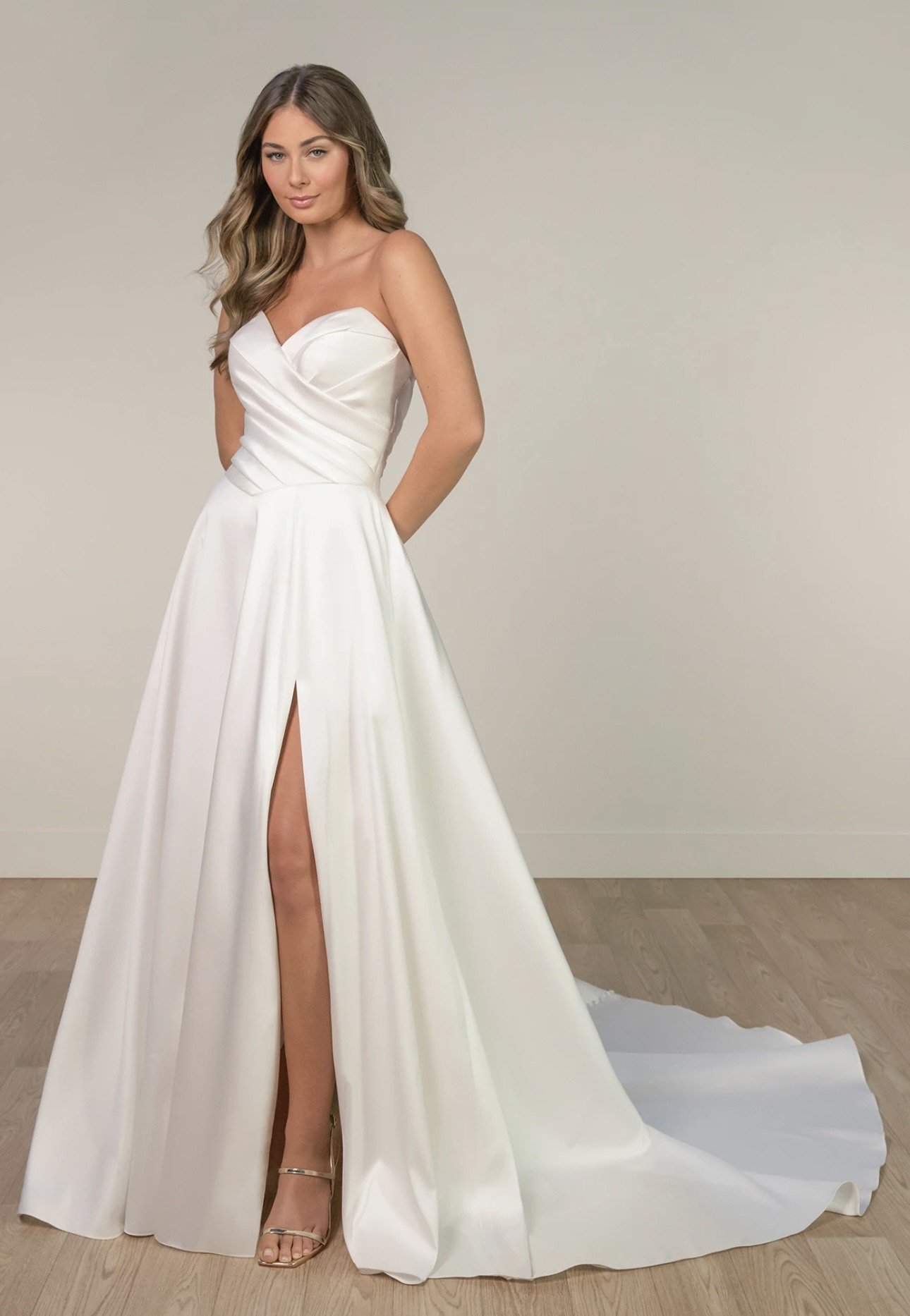Stella exudes timeless elegance with a modern twist. Crafted from smooth satin, this strapless wedding dress features a structured bodice adorned with intricate beaded lace that adds delicate sparkle and texture to the clean lines.