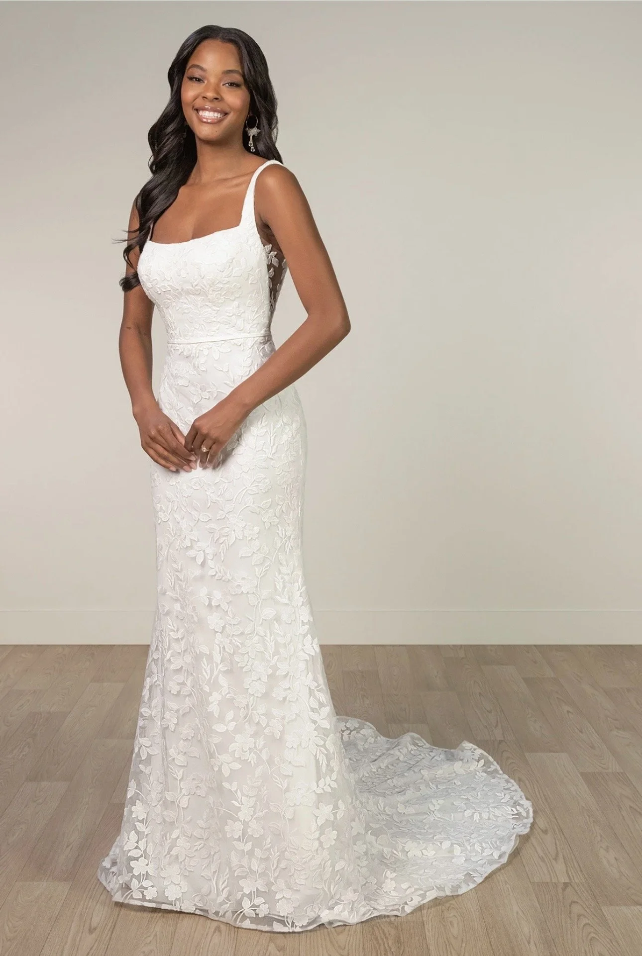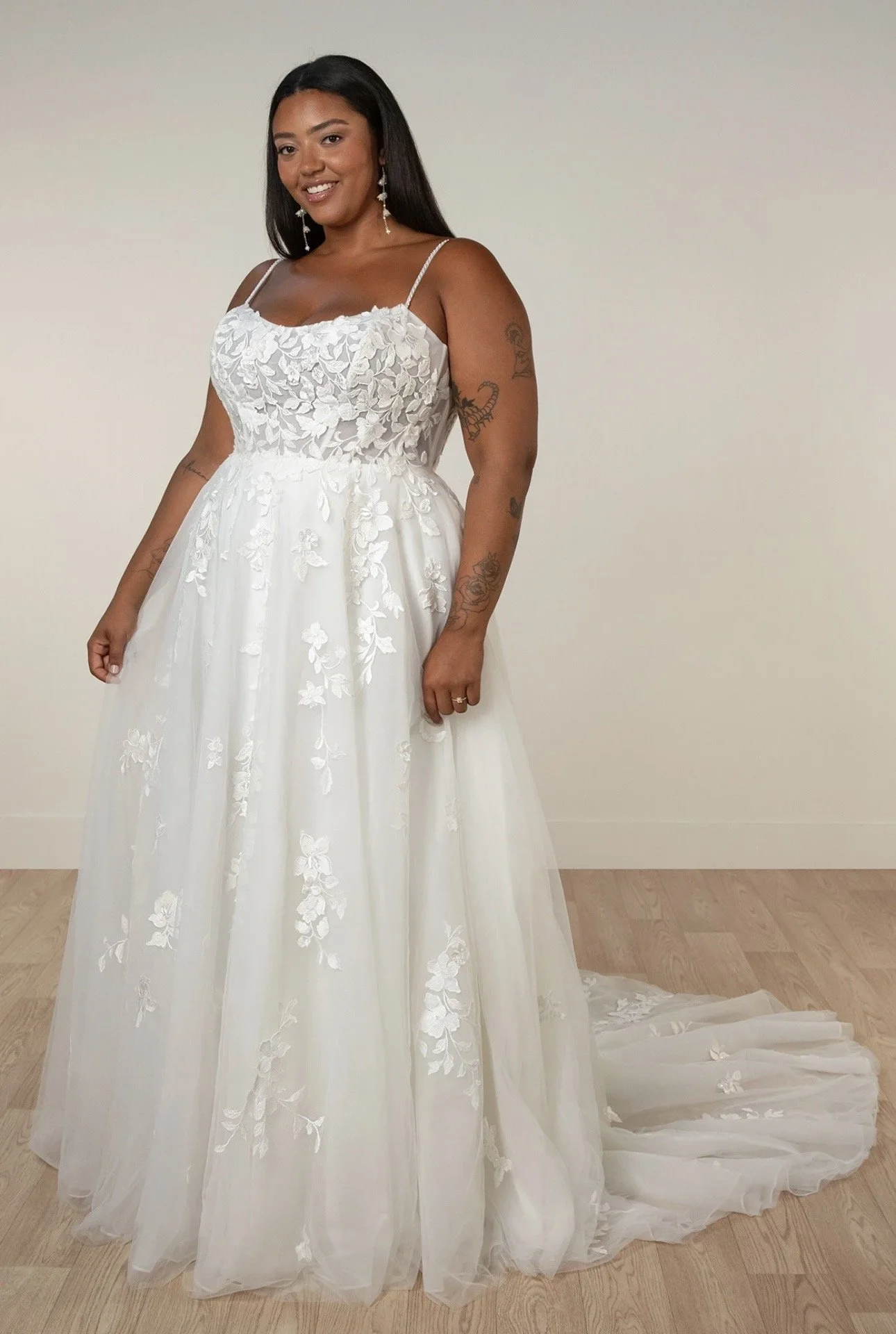 Frankie captivates with its delicate blend of classic elegance and modern design. Featuring a subtle scoop neckline framed by clean, simple straps, the gown is layered with a sheer tulle overlay adorned with allover leafy lace appliqués for a natural, textured effect.