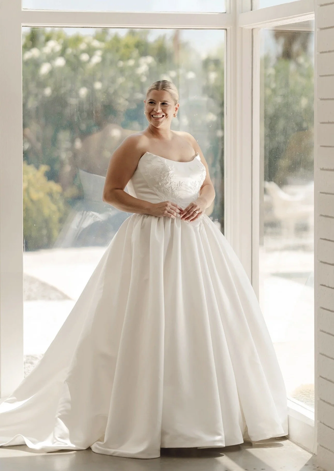 Effortless elegance defines Everly a minimalist wedding dress with timeless appeal. The strapless bodice features a romantic sweetheart neckline, softly draped to enhance the natural shape.